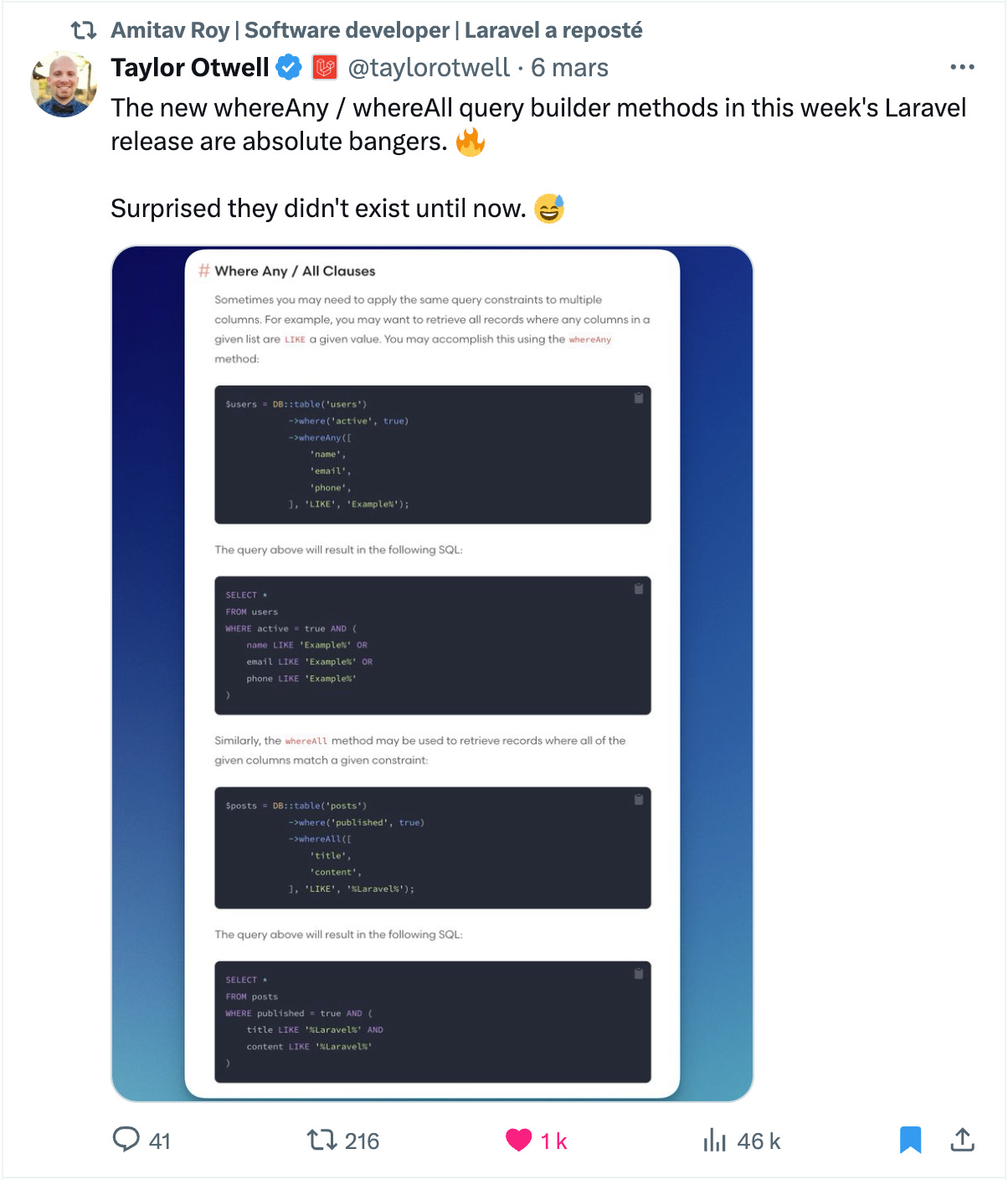 On y parle de Laravel 11, Laravel Stream Log, LaraNudge, Méthode toSql(), whereAny / whereAll query builder .