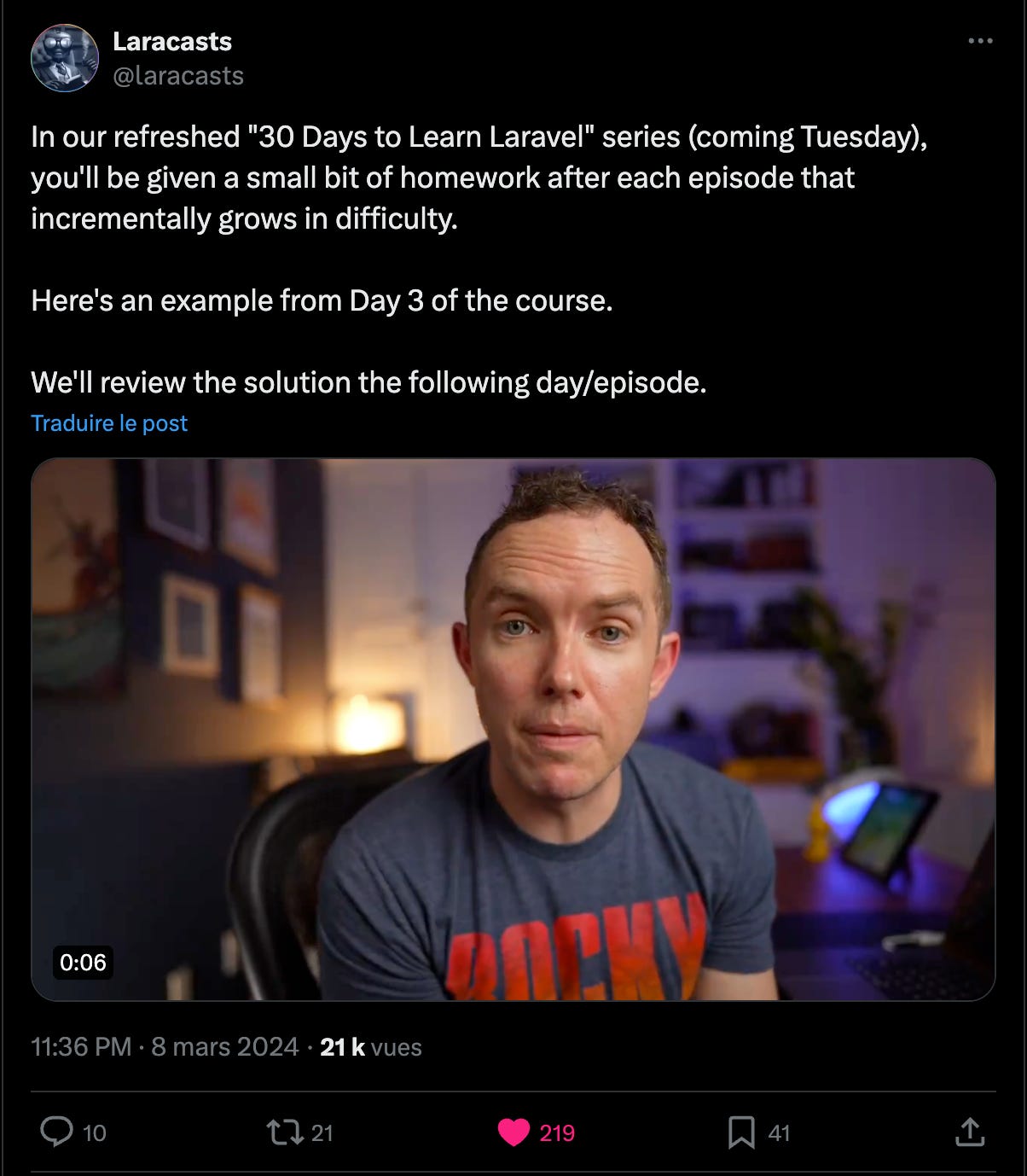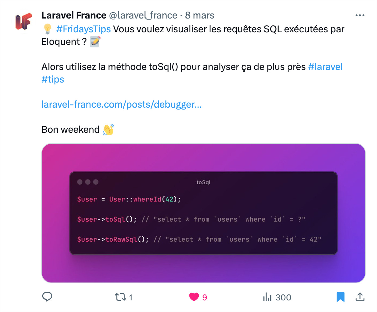 On retrouve les copains de Laravel France qui diffusent tous les vendredis une astuce sur Laravel. Allez les suivre pour ne pas en louper une seule.
